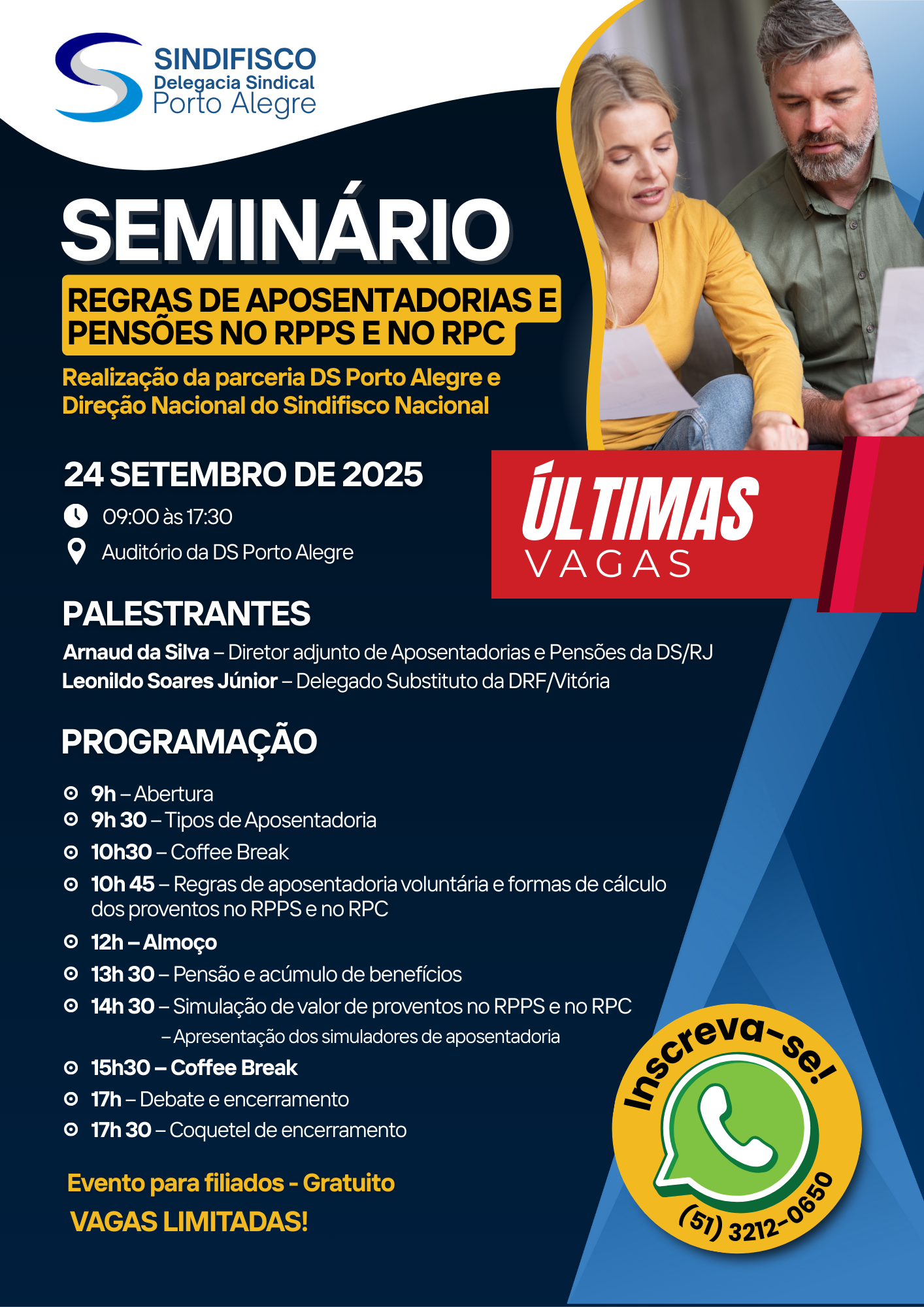 A DSPOA, em parceria com a Direção Nacional do Sindifisco Nacional, promoverá no próximo dia 24 de setembro de 2025 um importante Seminário sobre Regras de Aposentadorias e Pensões no RPPS e no RPC, direcionado aos filiados da nossa Delegacia Sindical.