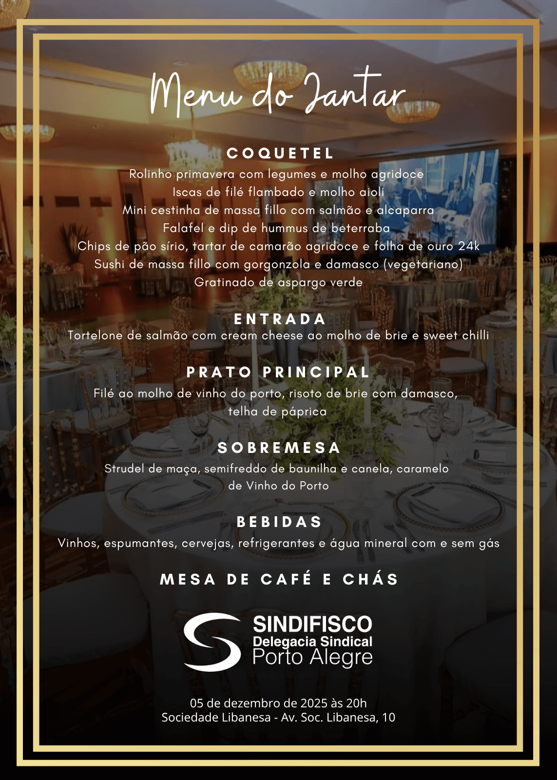 A diretoria da DSPOA convida todos os filiados para a Festa de Final de Ano - Jantar Dançante, com animação da Banda Só Amor, a realizar-se no dia 05 de dezembro de 2025 (sexta-feira), às 20 horas, na Sociedade Libanesa – Av. Soc. Libanesa, 10 - Boa Vista, em Porto Alegre.
